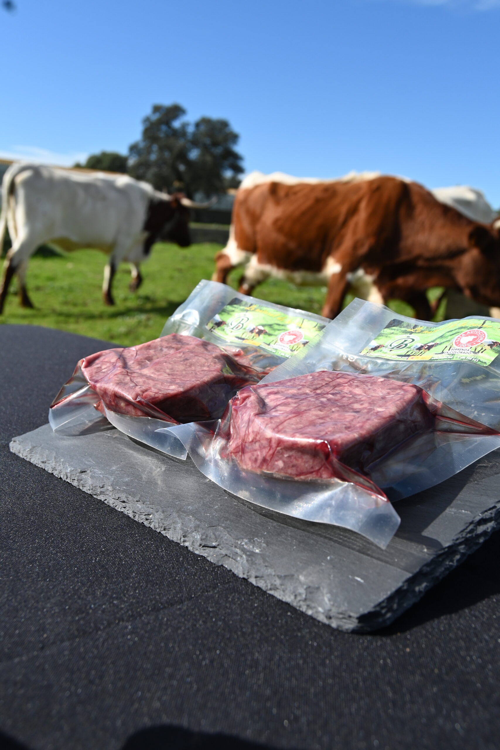 La hamburguesa se elabora a partir de carne seleccionada de cebones criados y procesados en España. El cebón berrendo, gracias a su crianza y alimentación, ofrece una carne con un veteado perfecto de grasa que, al cocinarse, potencia los aromas y mantiene una textura jugosa.